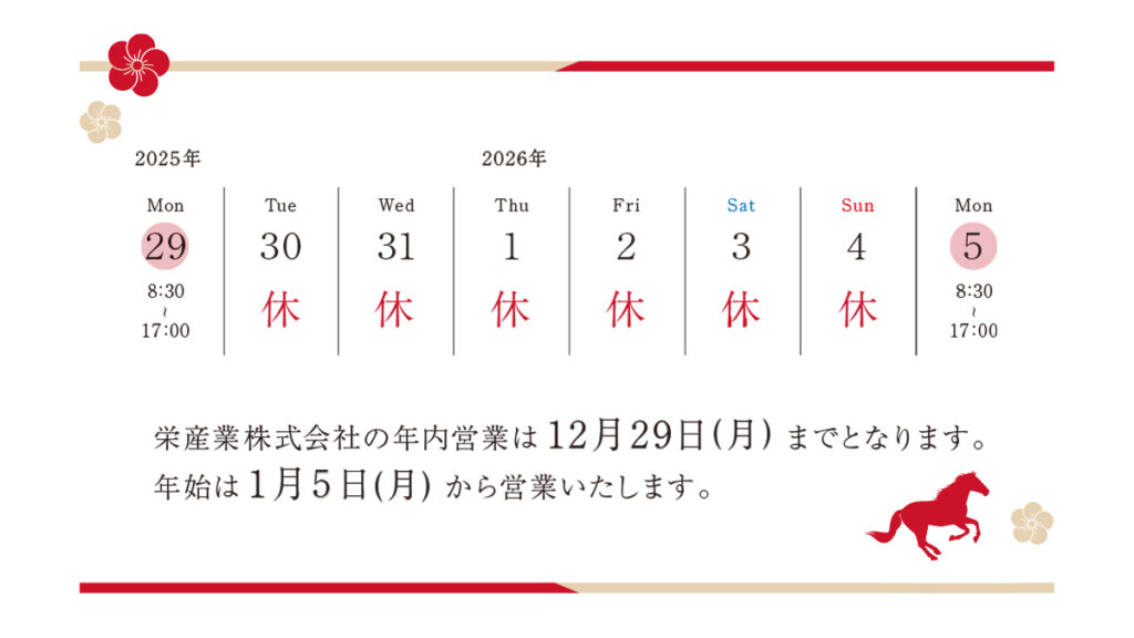誠に勝手ながら、年末年始の営業日を下記の通りとさせていただきます。